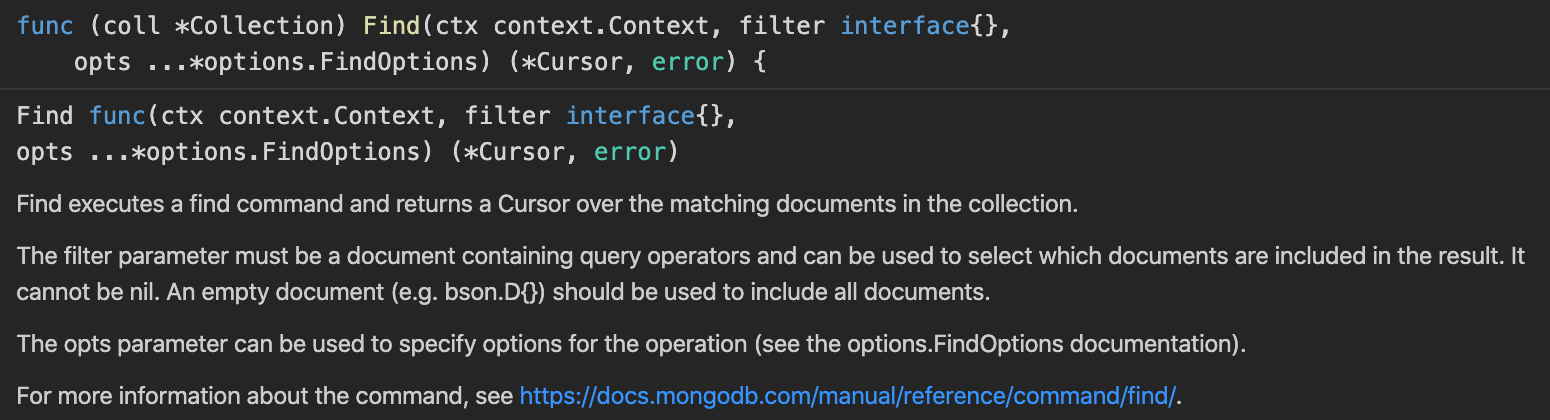 > *Collection에 존재하는 func : Input은 Context와 원하는 필터값이고, Output은 *Cursor와 error