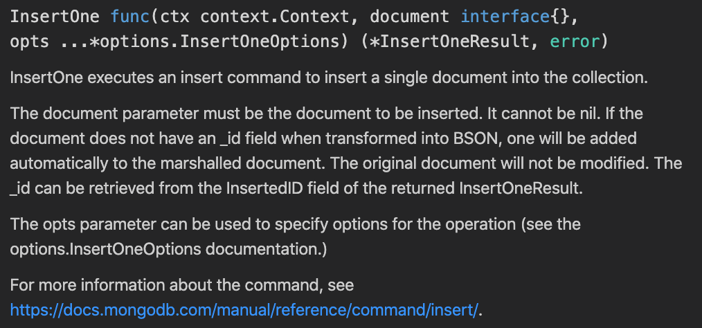 > *Collection에 존재하는 func : Input은 Context와 입력할 도큐먼트이고, Output은 *InserOneResult와 error가 나온다