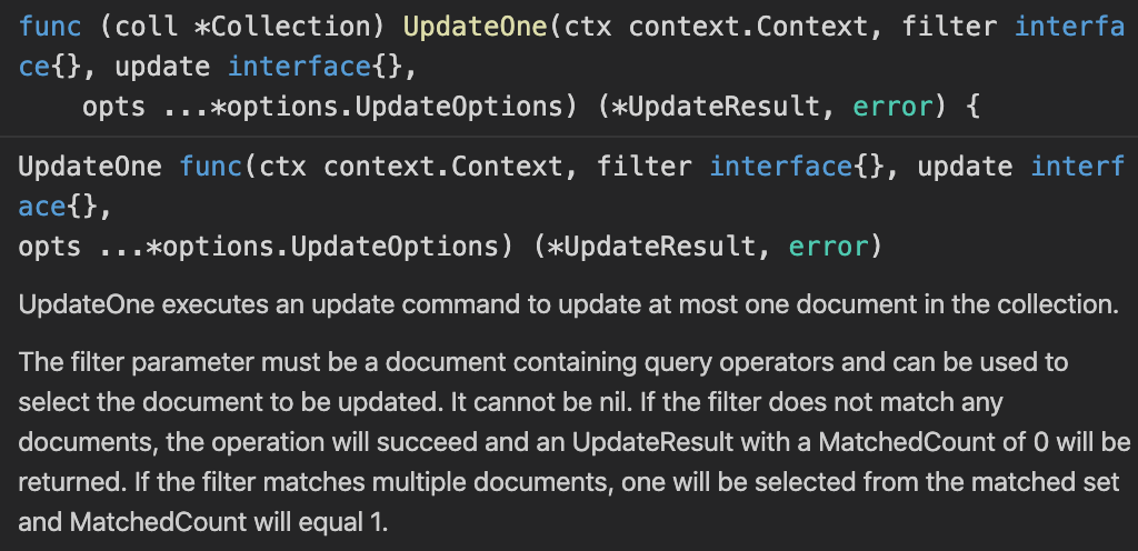> *Collection에 존재하는 func : Input은 Context와 원하는 필터(조건)과, 업데이트 내용, Output은 error이다