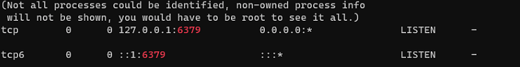 - 위 명령어를 사용하여 redis가 사용하는 6379 포트가 열려있는 지 확인 한다.